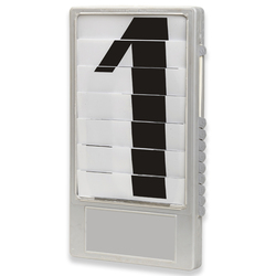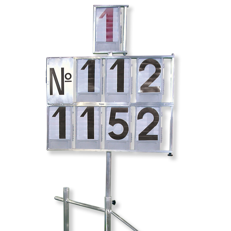 Fahrbare oder nicht fahrbare Ergebnisanzeigetafel mit Untergestell und Rädern, Rahmen und Zifferntableaus, Die Anzeigetafel ist jeweils von 0 - 9 durch Schieber einstellbar. Die Anzeigetafeln bestehen aus leichtem, wetterfestem GFK und sind drehbar. Die Rückseiten sind ideal als Werbeflächen geeignet.