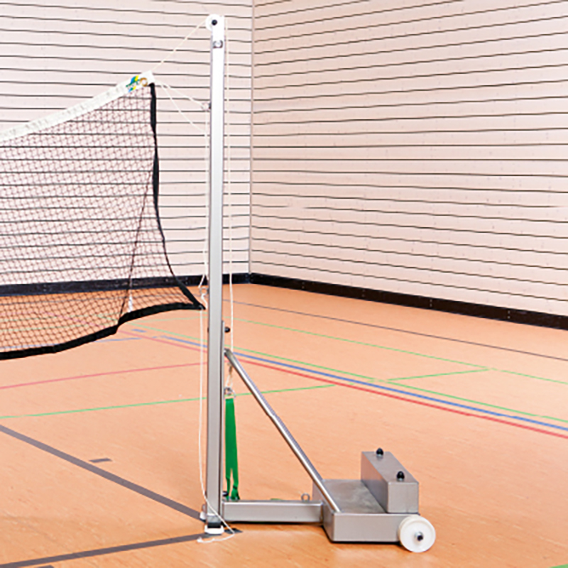 Dieser mobile Badmintonpfosten ist freistehend mit seitlich angebrachten Rollen für den leichten Transport ausgestattet. Die Transportrollen haben einen Durchmesser von etwa 10 cm. Das schwere Gewicht am Fussausleger sorgt dafür, dass der Spielpfosten stabil steht. Die Auslage ist ca. 64 cm. Die Pfosten bestehen aus aus robustem Stahlrohr mit einem Profil von 40 x 40 mm. Das obere Ende des Pfostens ist teleskopartig um bis zu 15 cm verstellbar, um die gewünschte Netz-Höhe zu erzielen (Einstellbar von ca. 155 bis 170 cm). Dieser Badminton-Spielpfosten ist nach den Vorschriften des Badminton-Verbandes ausgelegt. Gewicht ca. 80 kg.