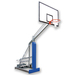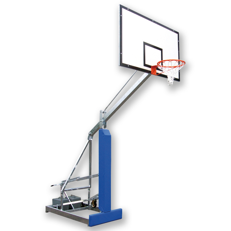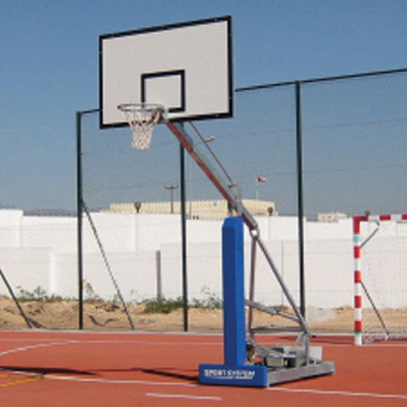 Fahrbare Basketball COLLEGE Anlage. Lackierte Stahlrohr Konstruktion mit einer kurzen Ausladung von 125 cm. Fahrbar anhand 3 integrierter Gummiräder. Platz für Gegengewicht (100 kg, beinhaltet) auf der Rückseite der Anlage. Front-Polsterung bezogen mit synthetischem, waschbaren Material. Mechanisch höhenverstellbar auf Wettspielhöhe 305 cm und Jugendspielhöhe 260 cm. Ausgestattet mit Spahnholzplatten Zielbrett auf lackiertem Stahlrahmen, fest angebrachte, abklappbare, lackierte Korbringe und Baumwollnetz. Inklusive Zubehör zum Befestigen der Anlage am Boden. Gewicht ca. 300 kg.