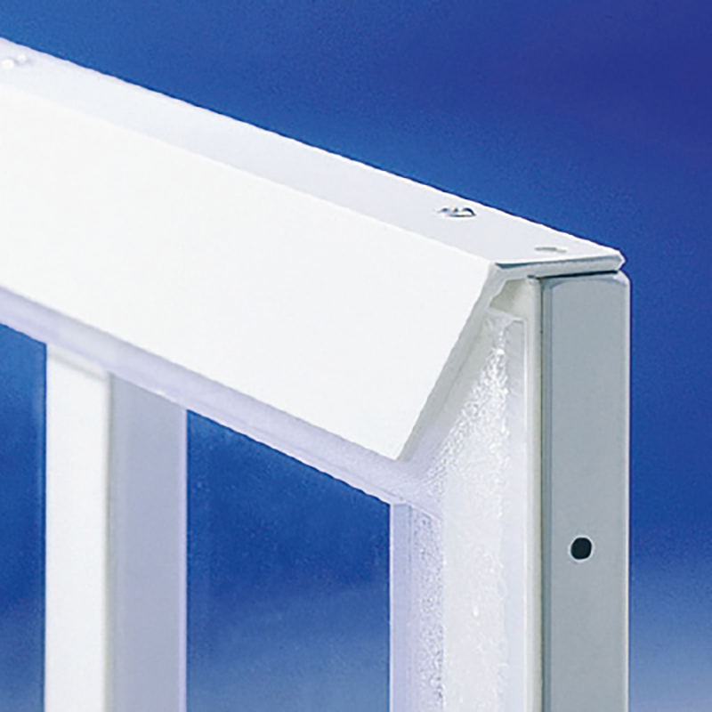 Acrylglasbrett auf Stahlrohrrahmen mit weissem Aluminiumwinkel-Profil vernietet. (keine Verschraubung durch das Acrylglasbrett!)