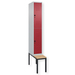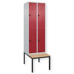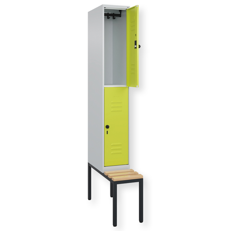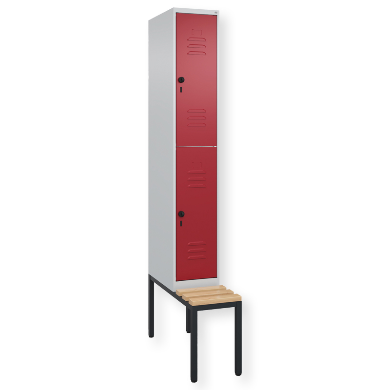 Doppelstöckiger Spind Classic PLUS, 1 Abteil mit 2 Fächern, Abteilbreite 300 mm, Korpus aus stabiler Stahlkonstruktion mit hochwertiger Einbrennbeschichtung für hohe UV- und Korrosionsbeständigkeit, mit hinteren Belüftungsöffnungen oben und unten, innen je Fach 1 stabile Garderobenstange aus Ovalprofil mit 3 verdrehsicheren Doppel-Schiebehaken inkl. Systemaufnahme, mit untergebauter Sitzbank, Gestell aus stabilem Vierkant-Stahlrohr 30 x 30 mm, mit verstellbaren Bodengleitern für einfachen Niveauausgleich, Türöffnungen 110 Grad, Türaufhängung rechts, Stahl-Türen mit Soft-Anschlag und geschlossenen Seitenprofilen für hohe Stabilität, mit Lüftungskiemen oben und unten sowie eingestanztem Etikettenrahmen, Türaufhängung in stabilen Drehbolzen, 2 Ergonomische Sicherheits-Drehriegel für Vorhangschlösser mit Bügelstärke 6 bis 8 mm, inkl. Tür-Schutz, Sitzleisten aus Buche-Hartholz, im Profil ca. 60 x 30 mm, für guten Sitzkomfort, allseitig gehobelt, klarlackiert mit naturgegebenen Farbunterschieden.