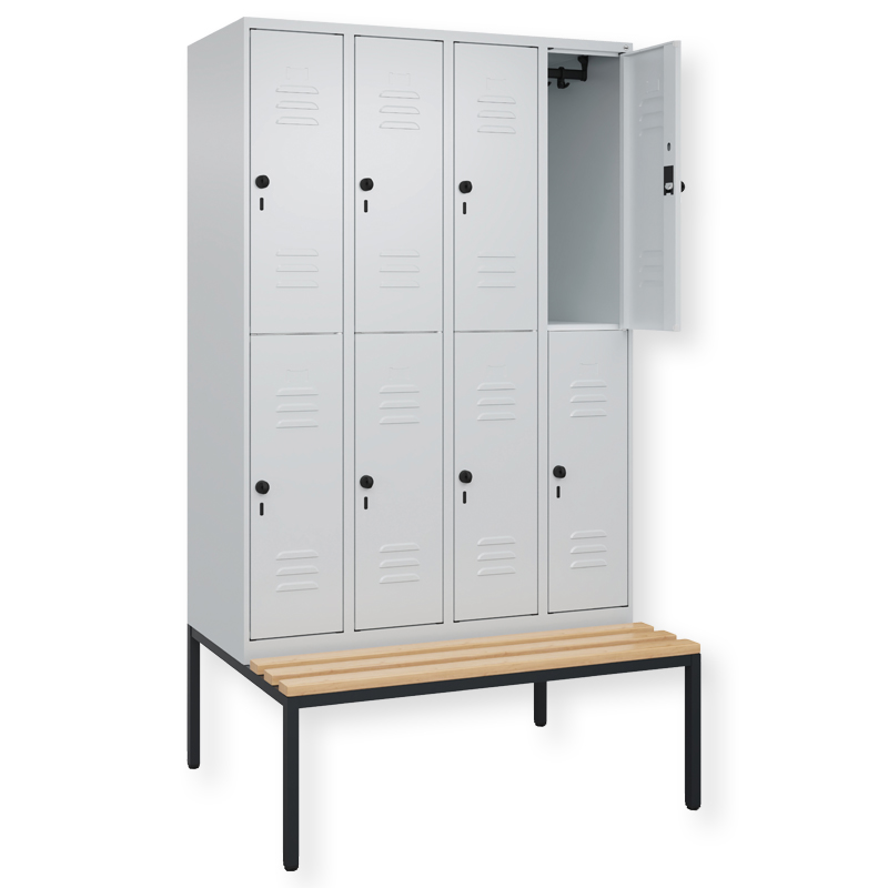 Doppelstöckiger Spind Classic PLUS, 1 Abteil mit 2 Fächern, Abteilbreite 300 mm, Korpus aus stabiler Stahlkonstruktion mit hochwertiger Einbrennbeschichtung für hohe UV- und Korrosionsbeständigkeit, mit hinteren Belüftungsöffnungen oben und unten, innen je Fach 1 stabile Garderobenstange aus Ovalprofil mit 3 verdrehsicheren Doppel-Schiebehaken inkl. Systemaufnahme, mit untergebauter Sitzbank, Gestell aus stabilem Vierkant-Stahlrohr 30 x 30 mm, mit verstellbaren Bodengleitern für einfachen Niveauausgleich, Türöffnungen 110 Grad, Türaufhängung rechts, Stahl-Türen mit Soft-Anschlag und geschlossenen Seitenprofilen für hohe Stabilität, mit Lüftungskiemen oben und unten sowie eingestanztem Etikettenrahmen, Türaufhängung in stabilen Drehbolzen, 2 Ergonomische Sicherheits-Drehriegel für Vorhangschlösser mit Bügelstärke 6 bis 8 mm, inkl. Tür-Schutz, Sitzleisten aus Buche-Hartholz, im Profil ca. 60 x 30 mm, für guten Sitzkomfort, allseitig gehobelt, klarlackiert mit naturgegebenen Farbunterschieden.
