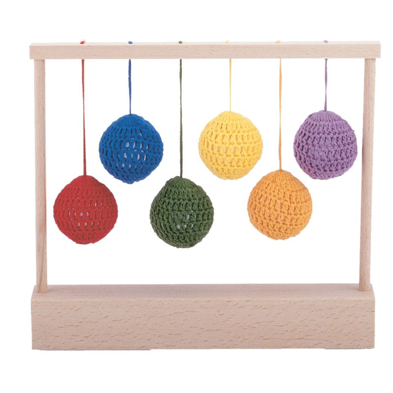 - Sechs Bälle, weich umhäkelt in den Farben des Regenbogens mit sechs farbigen Schnüren zum Aufhängen.