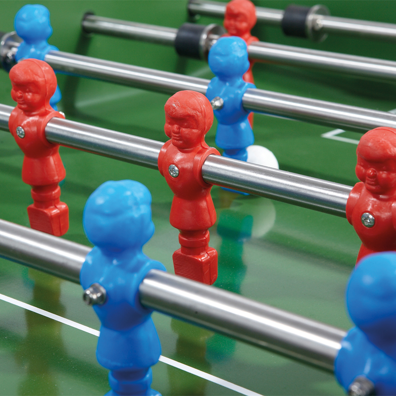 Konstruktion aus thermoplastischem Kunstharz und Fiberglas. Verbindungselemente aus rostfreiem Edelstahl. Spielstangen 16 mm zweifach verchromt. Spielfläche aus speziell temperiertem Glas. Witterungsresistente Gleitlager. Die Spielerfiguren sind extrem widerstandsfähig. Eingelassene Torzähler sowie Ballrücklauf auf beiden Seiten. Spielstangen gefedert mit perfektem Rückstosseffekt. Balleinwurfschalen in Höhe der Mittellinie beidseitig. Zusätzliche Ablagen rechts und links neben den Torzählern.