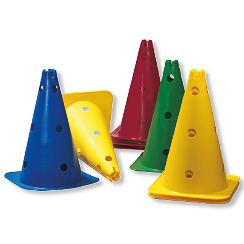 Dieser Lochkegel ist mit zwölf Löchern ausgestattet und kann in Kombination mit Turnstäben auch als Hürde, Slalomstange oder kleines Tor benutzt werden. Ausserdem kommen die Markierkegel gerne bei verschiedenen Teamsportarten in den Trainingseinheiten zum Einsatz. Vielfältige Übungsformen zu Koordination, Dribbling oder Beweglichkeit sind möglich.