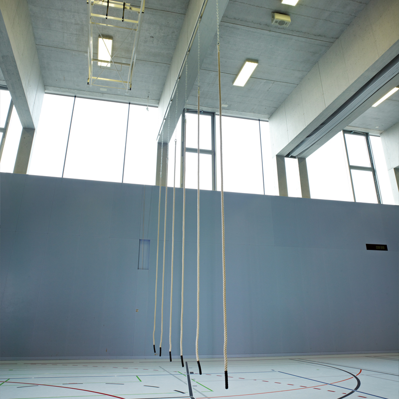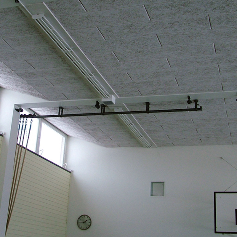 Tau aus Hanf Ø 33mm mit Kunststoffende an wartungsfreier Laufrolle angehängt. Deckenlaufschiene aus Stahlblech, am Ende mit Klinkenarretierung zur Fixierung der Taue. Seitlicher Wandhalter für Taue mit Befestigung von Entriegelungsseil. Deckenschiene mit Kurve bis zu 90° möglich.