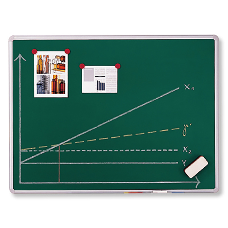 Dunkelgrüne, blend- und reflexfreie emaillierte Tafeloberfläche, die magnethaftend ist, sowie trocken und nass abwischbar ist. Die Kreidetafel besteht aus einem pflegeleichten, silbereloxierten Alu-Rahmen mit Kunststoffecken. Lieferung inklusive Montagezubehör.