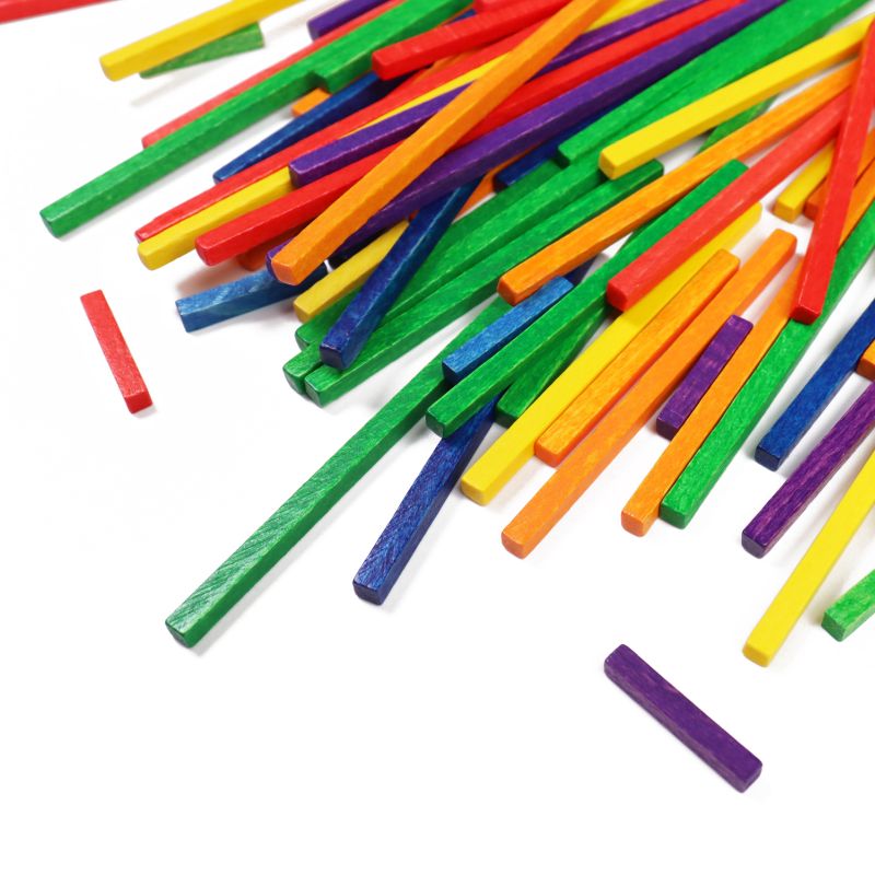 Mischung Legestäbchen aus Buchenholz in den Farben rot, orange, gelb, grün, blau und violett, in den Längen 25, 50, 75 und 100 mm (Stärke 4 mm).