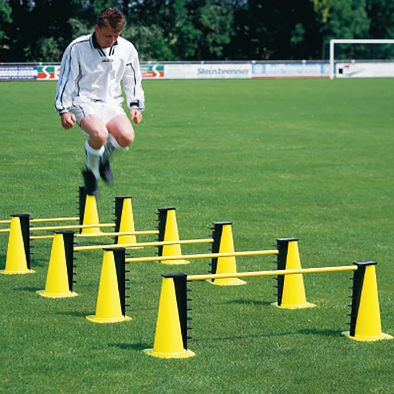 Die Trainingshürde JUMP, bestehend aus zwei Kunststoffkegeln, einem Stab und mehreren Einhängetreppchen. Wird dieser Stab bei Ausführung einer Übung berührt, fällt er einfach vom Einhängetreppchen. Dadurch ist das Verletzungsrisiko minimiert und der Stab geht auch bei stärkerer Berührung nicht zu Bruch. Perfekt geeignet für Training oder Schule, Laufkoordination, Schnelligkeitstraining oder Aufwärmprogramm.