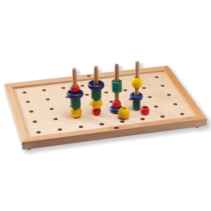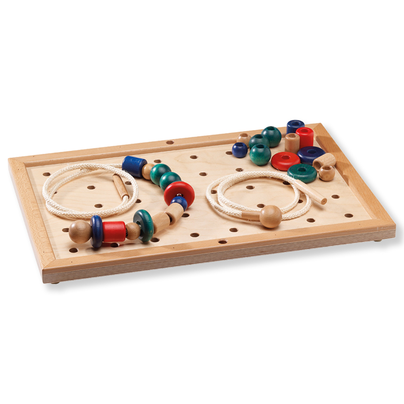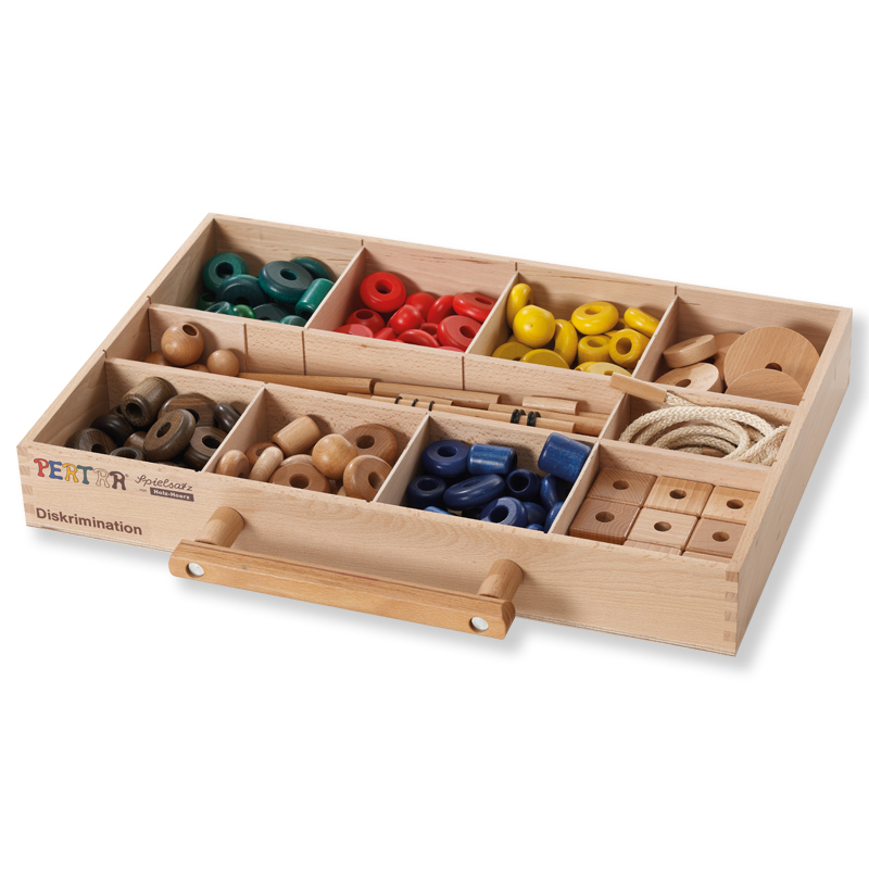 Gleichheit und Unterschied - Die Merkmalsuche ist eine wichtige Voraussetzung für zielgerichtetes Handeln. Oft wird die Merkmalsuche durch impulsives Handeln zu früh abgebrochen und die Aufgabenstellung nicht in ihrer Gesamtheit erfasst. Durch das Sortieren der Perlen nach Merkmalen wie Farbe, Form oder Grösse werden Gleichheit und Unterschied bewusst. Beim Aufnehmen, Abspeichern und Nachfädeln von Vorlagenketten wird die Merkfähigkeit geübt. Beim Auffädeln der Perlen auf Stäbe oder Seilen werden Augen-Hand- oder Augen-Hand-Hand-Koordination geschult.