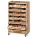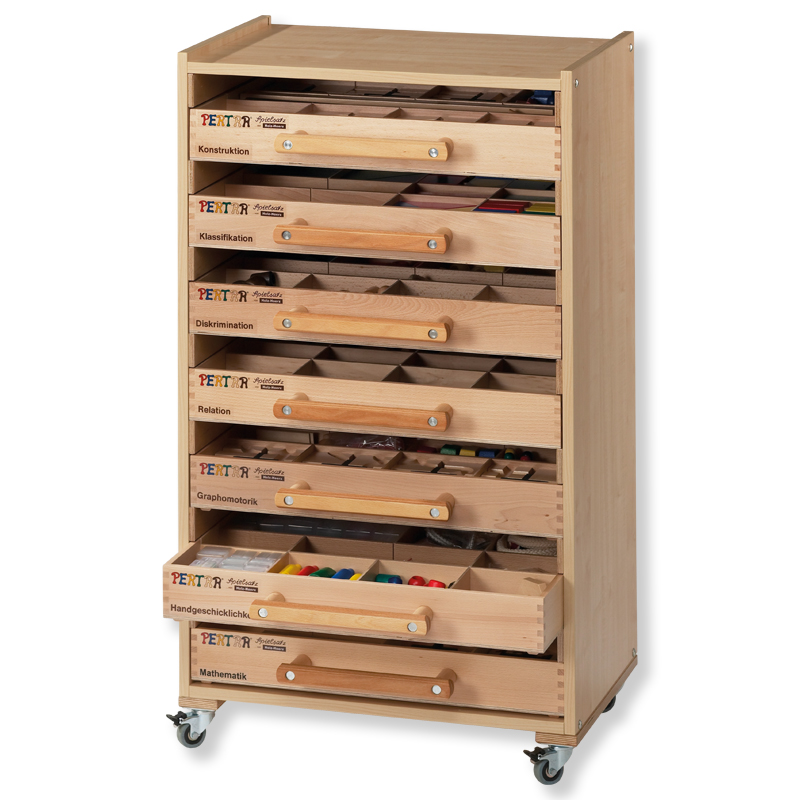 Aufbewahrungshilfe für die 7 Pertra® Koffer. Material aus Holz mit feststellbaren Rollen.