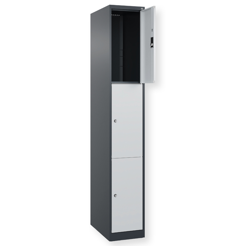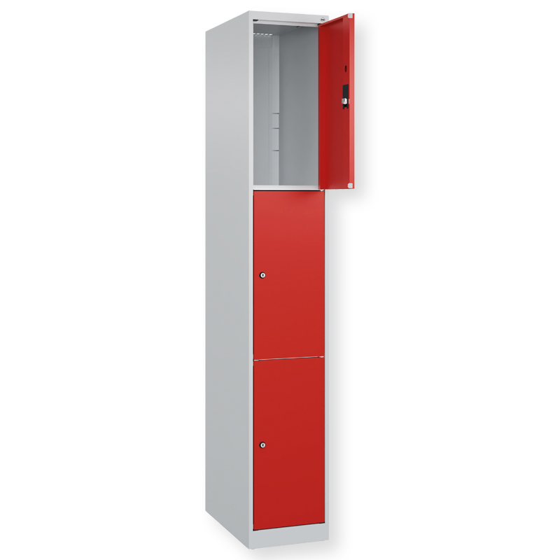 Schliessfachschrank Classic PLUS, 1 Abteil mit 3 Fächern, Abteilbreite 300 mm, Korpus aus stabiler Stahlkonstruktion mit hochwertiger Einbrennbeschichtung für hohe UV- und Korrosionsbeständigkeit, mit Bodengleitern als praktischer Schrank- und Fussbodenschutz, Türöffnungen 110 Grad, Türaufhängung rechts, Stahl-Türen mit Soft-Anschlag und geschlossenen Seitenprofilen für hohe Stabilität, Türaufhängung in stabilen Drehbolzen, 3 Zylinderschlösser mit 2 Schlüsseln, Schliesskreis bis 1000 verschiedene Schliessungen.