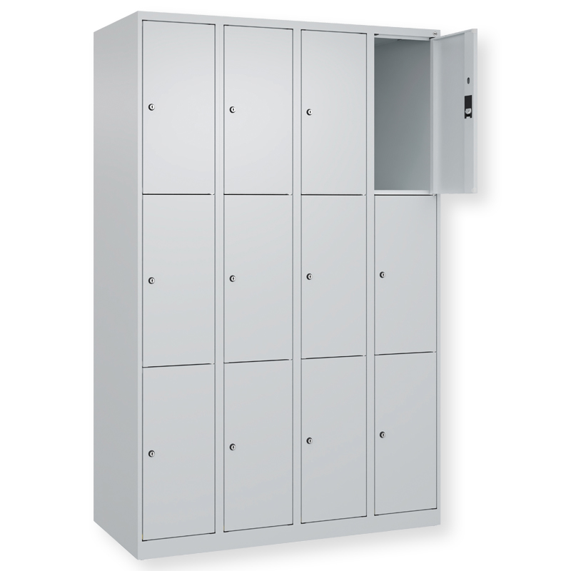 Schliessfachschrank Classic PLUS, 1 Abteil mit 3 Fächern, Abteilbreite 300 mm, Korpus aus stabiler Stahlkonstruktion mit hochwertiger Einbrennbeschichtung für hohe UV- und Korrosionsbeständigkeit, mit Bodengleitern als praktischer Schrank- und Fussbodenschutz, Türöffnungen 110 Grad, Türaufhängung rechts, Stahl-Türen mit Soft-Anschlag und geschlossenen Seitenprofilen für hohe Stabilität, Türaufhängung in stabilen Drehbolzen, 3 Zylinderschlösser mit 2 Schlüsseln, Schliesskreis bis 1000 verschiedene Schliessungen.
