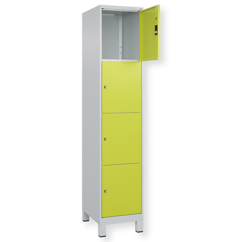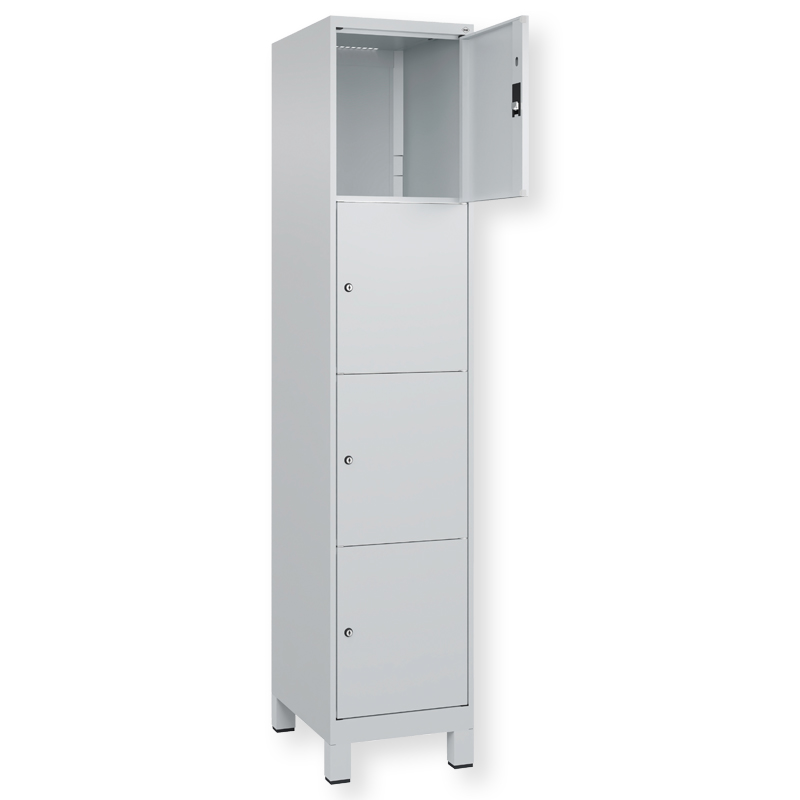 Schliessfachschrank Classic PLUS, 1 Abteil mit 4 Fächern, Abteilbreite 400 mm, Korpus aus stabiler Stahlkonstruktion mit hochwertiger Einbrennbeschichtung für hohe UV- und Korrosionsbeständigkeit, Türöffnungen 110 Grad, Türaufhängung rechts, Stahl-Türen mit Soft-Anschlag und geschlossenen Seitenprofilen für hohe Stabilität, Türaufhängung in stabilen Drehbolzen, 4 Zylinderschlösser mit 2 Schlüsseln, Schliesskreis bis 1000 verschiedene Schliessungen, 100 mm hohe Füsse aus Kunststoff für erweiterten Korrosionsschutz.