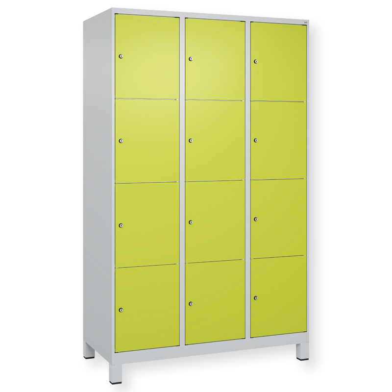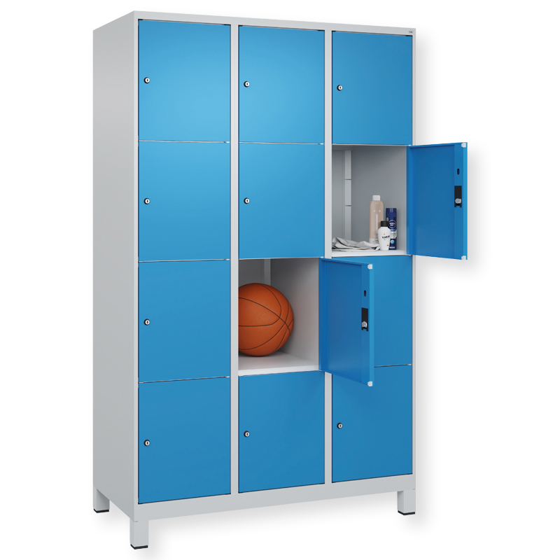 Schliessfachschrank Classic PLUS, 1 Abteil mit 4 Fächern, Abteilbreite 400 mm, Korpus aus stabiler Stahlkonstruktion mit hochwertiger Einbrennbeschichtung für hohe UV- und Korrosionsbeständigkeit, Türöffnungen 110 Grad, Türaufhängung rechts, Stahl-Türen mit Soft-Anschlag und geschlossenen Seitenprofilen für hohe Stabilität, Türaufhängung in stabilen Drehbolzen, 4 Zylinderschlösser mit 2 Schlüsseln, Schliesskreis bis 1000 verschiedene Schliessungen, 100 mm hohe Füsse aus Kunststoff für erweiterten Korrosionsschutz.