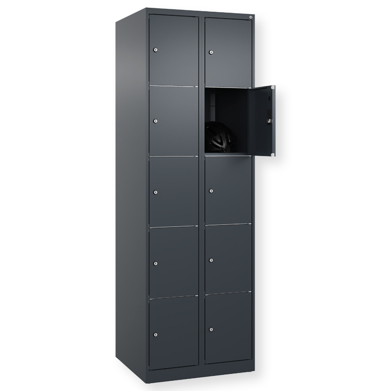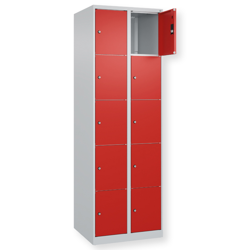Schliessfachschrank Classic PLUS, 1 Abteil mit 5 Fächern, Abteilbreite 300 mm, Korpus aus stabiler Stahlkonstruktion mit hochwertiger Einbrennbeschichtung für hohe UV- und Korrosionsbeständigkeit, mit Bodengleitern als praktischer Schrank- und Fussbodenschutz, Türöffnungen 110 Grad, Türaufhängung rechts, Stahl-Türen mit Soft-Anschlag und geschlossenen Seitenprofilen für hohe Stabilität, Türaufhängung in stabilen Drehbolzen, 5 Zylinderschlösser mit 2 Schlüsseln, Schliesskreis bis 1000 verschiedene Schliessungen.