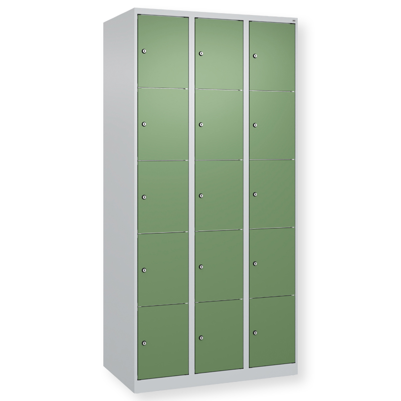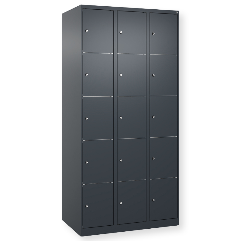 Schliessfachschrank Classic PLUS, 1 Abteil mit 5 Fächern, Abteilbreite 300 mm, Korpus aus stabiler Stahlkonstruktion mit hochwertiger Einbrennbeschichtung für hohe UV- und Korrosionsbeständigkeit, mit Bodengleitern als praktischer Schrank- und Fussbodenschutz, Türöffnungen 110 Grad, Türaufhängung rechts, Stahl-Türen mit Soft-Anschlag und geschlossenen Seitenprofilen für hohe Stabilität, Türaufhängung in stabilen Drehbolzen, 5 Zylinderschlösser mit 2 Schlüsseln, Schliesskreis bis 1000 verschiedene Schliessungen.