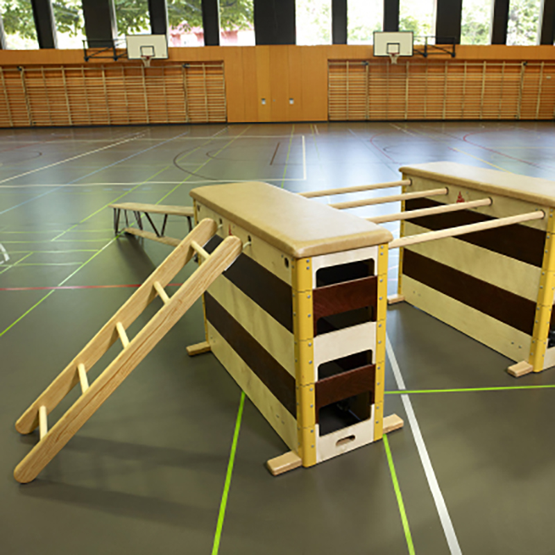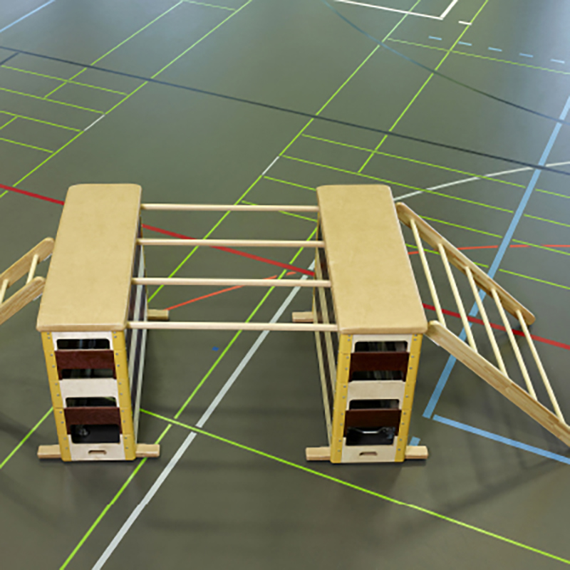 Das Wiba Sport Sprungkasten-Parcours-Set besteht aus zwei Sprungkästen, vier Holmen und zwei Leitern. Die Kastenteile sind stirnseitig mit Aussparungen zum Einhängen der Leitern versehen, längsseitig verfügt das oberste Element auf jeder Seite über je 4 Bohrungen zur Aufnahme der ovalen Holme. In Kombination mit Turnbänken und weiteren Geräten lassen sich zahlreiche Übungsformen realisieren, wodurch das Sprungkasten-Set zu einem universell einsetzbaren Sportgerät wird.