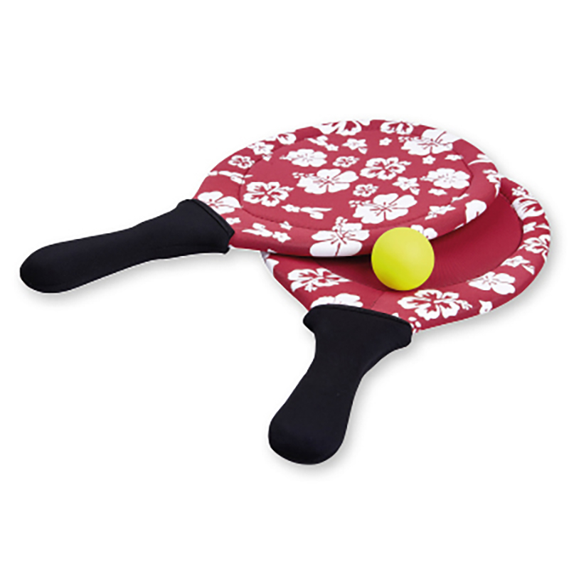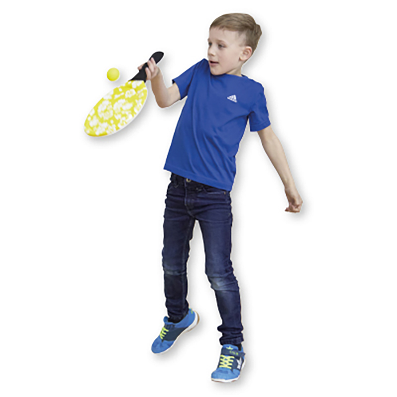 Die Schläger mit leichtem Kunststoffrahmen und Neoprenbezug sorgen für den besonderen “Trampolineffekt“ beim Treffen des Balles. Farben rot, blau, gelb sortiert.