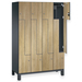 Schrank auf 130 mm hohen Füssen. Türen aus robustem HPL mit Holzdekor.. Für 2 Nutzer auf geringer Stellfläche ein Optimum an Nutzung von Innenraum, auch für längere Kleidungsstücke. Jedes Abteil mit seitlicher 3-fach Hakenleiste. Jedes Abteil mit Ablagefläche und Hakenleiste.