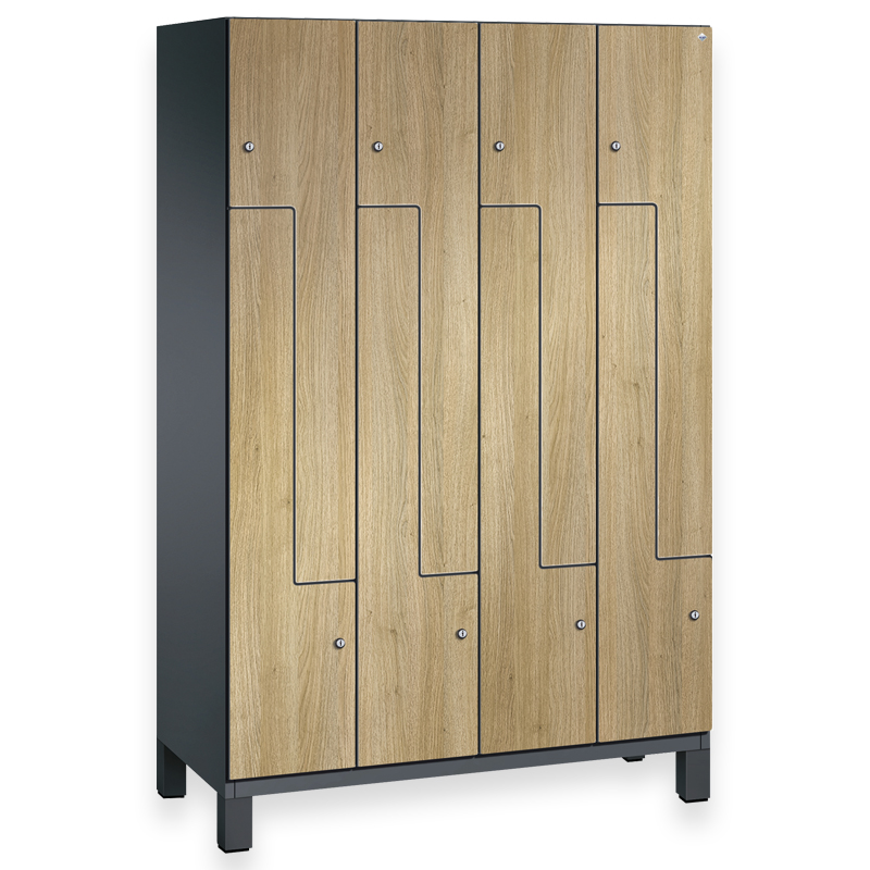 Schrank auf 130 mm hohen Füssen. Türen aus robustem HPL mit Holzdekor.. Für 2 Nutzer auf geringer Stellfläche ein Optimum an Nutzung von Innenraum, auch für längere Kleidungsstücke. Jedes Abteil mit seitlicher 3-fach Hakenleiste. Jedes Abteil mit Ablagefläche und Hakenleiste.