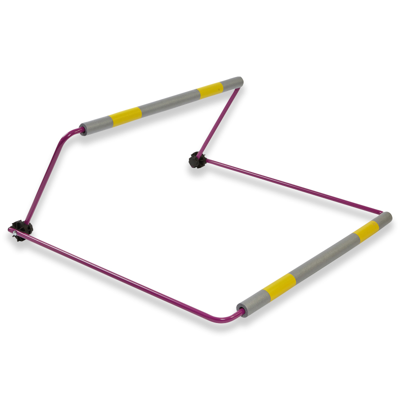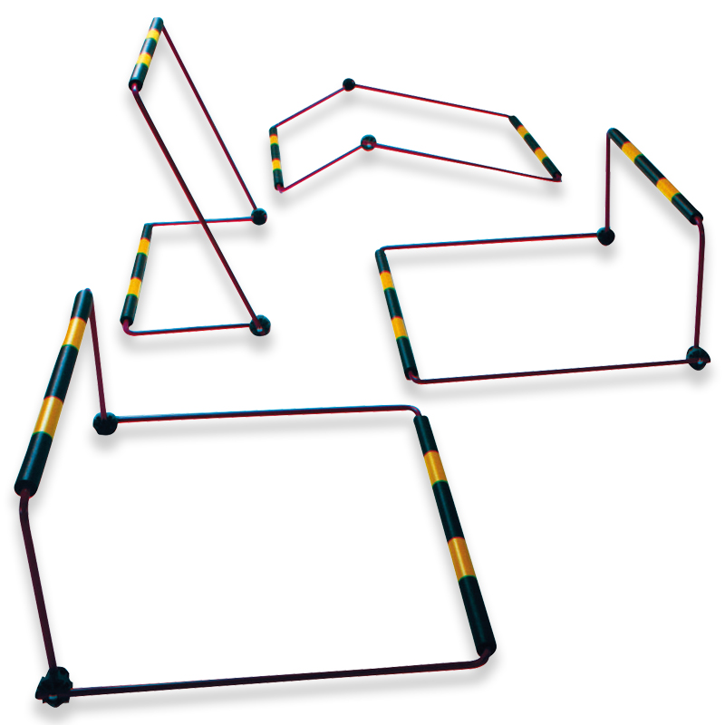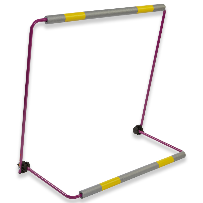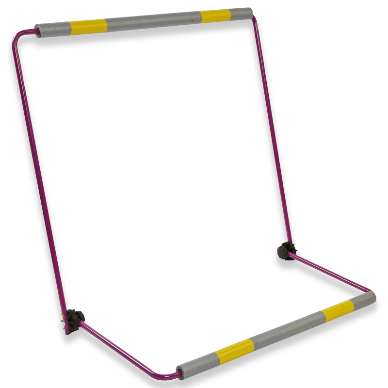 Die Zacharias-Übungshürden bestehen aus zwei Metallbügeln, die durch zwei Kunststoff-Tellergelenke verbunden sind. Sie sind leicht aber standsicher, einfach in der Anwendung und Handhabung und sind innerhalb kurzer Zeit platzsparend zusammengeklappt. Das vereinfacht Transport und Lagerung