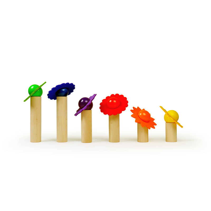 Ganz individuell oder nach Farben geordnet können Blüten zusammengesteckt und gestaltet werden. Die dicken Stäbe sind auf einer Seite nach innen gewölbt, so dass eine kugelförmige Blüte in der Wölbung Halt findet. So entstehen wunderschöne Blumen mit langem oder kurzem Stiel. Mit Geschick können die Blumen auch im Laufen balanciert werden. Z. B. mit jeweils einer Blume in beiden Händen. Die Blüten tanzen wie Kreisel auf der Tischplatte oder auf dem Fussboden, wenn sie in Schwung gebracht werden.