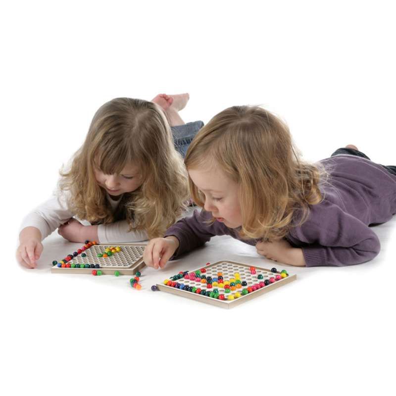 Eine Seite zeigt sauber in Reihen angeordnete Kugelmulden – ideal zum Legen von klaren Mustern, Farbverläufen oder logischen Reihenfolgen. Die andere Seite überrascht mit versetzt angeordneten Mulden, die sich hervorragend zum dreidimensionalen Bauen und intuitiven Legen eignen.
