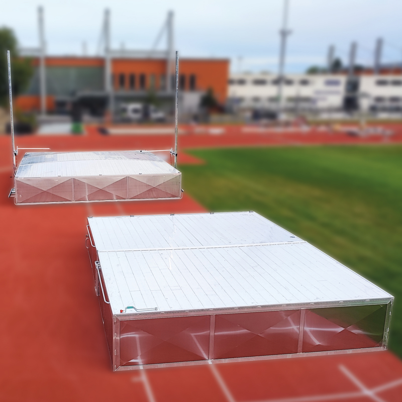 für Stabhochsprunganlagen. Vollverschweis-ste Aluminium-Konstruktion mit 4 starren Rädern. Besonders grosse Kunststoffräder ermöglichen ein leichtes Verschieben der Anlage. Die Abdeckungen werden vollverschweisst und zweiteilig geliefert. Die Räder sind verdeckt angeordnet. Die beiden Hälften werden mit einem Spannhebelverschluss fest zusammengedrückt. Die Abdeckungen sind abschliessbar. Lieferung ohne Schloss.