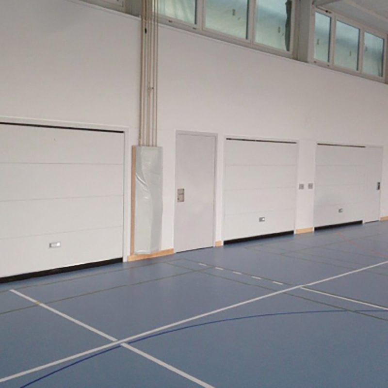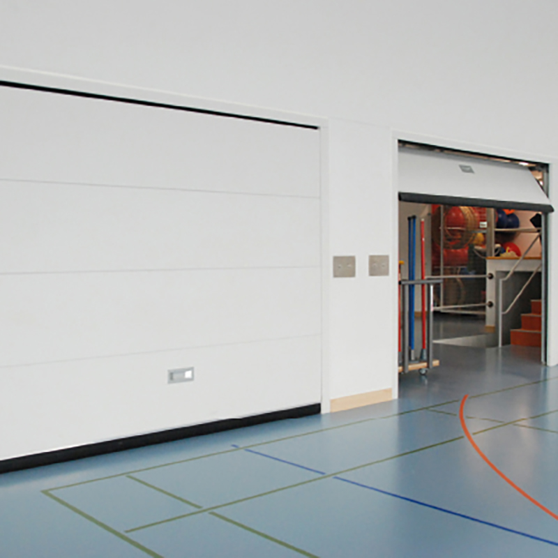 Das Sporthallen-Sektionaltor wird aus Holzverbundplatten gefertigt und flächenbündig mit der Hallenverkleidung bzw. dem Prallwand-Aufbau montiert. Auf Wunsch kann die Torfläche auch mit textilem Prallwand-Belag belegt werden. Der Gewichtsausgleich erfolgt über eine Torsionsfederwelle mit geprüfter Federbruchsicherung. Mit einem elektrischen Antrieb lässt sich das Tor auch automatisch bedienen.