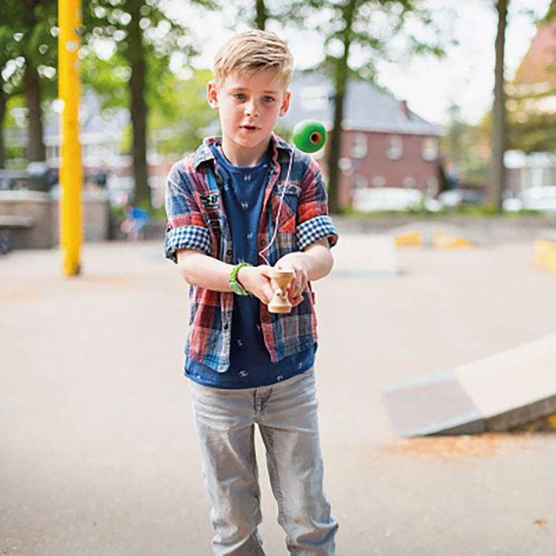 Das Kendama ist ein japanisches Geschicklichkeitsspiel welches eine Vielzahl an Übungen und Tricks bietet. Es besteht aus einer Kugel, die ein Loch hat und durch einen Faden mit dem Griff verbunden ist. Das Grundziel des Spiels ist es, die Kugel an der Schnur aus einer hängenden Position nach oben zu ziehen und auf einem der drei Teller oder mit dem Loch auf der Spitze zu fangen. Darauf aufgebaut können verschiedene Kombinationen und Tricks gemeistert werden.