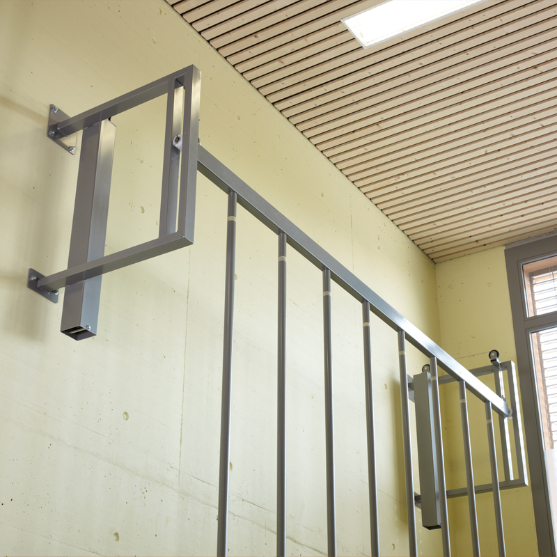 Stangen aus Stahlrohr Ø 42mm, zum Klettern senkrecht oder schräg nach vorn rollbar. Versorgt werden die Kletterstangen schräg nach hinten an die Wand. Bodentraverse auf Kunststoffwalzen laufend. Bodenschalen aus Kunststoff für senkrechte Stellung der Stangen. Wandkonsolen mit