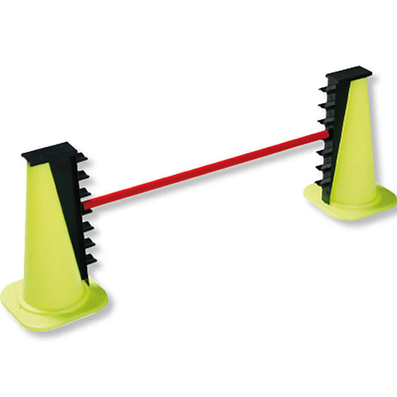 Die Trainingshürde JUMP, bestehend aus zwei Kunststoffkegeln, einem Stab und mehreren Einhängetreppchen. Wird dieser Stab bei Ausführung einer Übung berührt, fällt er einfach vom Einhängetreppchen. Dadurch ist das Verletzungsrisiko minimiert und der Stab geht auch bei stärkerer Berührung nicht zu Bruch. Perfekt geeignet für Training oder Schule, Laufkoordination, Schnelligkeitstraining oder Aufwärmprogramm.