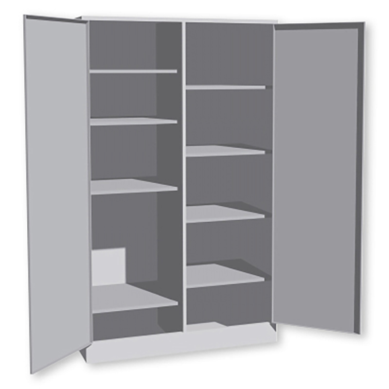 pulverbeschichtet in RAL 7035, Lichtgrau. Inneneinrichtung mit verstellbaren Tablaren, vorne mit Abrollrand damit die Bälle nicht herunterfallen. Ausführung mit Vollblechtüren oder mit zentraler Teilperforation (bxh) 270 x 1620 mm, 4-kt 20 mm. Türen mit vertikalen Verstärkungsrippen innen. Dreipunkt-Stangenverschluss, versenkter Drehgriff aus Kunststoff mit integriertem Zylinderschloss mit 2 Schlüsseln.