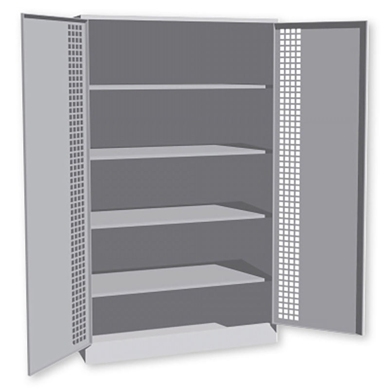 pulverbeschichtet in RAL 7035, Lichtgrau. Inneneinrichtung mit verstellbaren Tablaren, vorne mit Abrollrand damit die Bälle nicht herunterfallen. Ausführung mit Vollblechtüren oder mit zentraler Teilperforation (bxh) 270 x 1620 mm, 4-kt 20 mm. Türen mit vertikalen Verstärkungsrippen innen. Dreipunkt-Stangenverschluss, versenkter Drehgriff aus Kunststoff mit integriertem Zylinderschloss mit 2 Schlüsseln.
