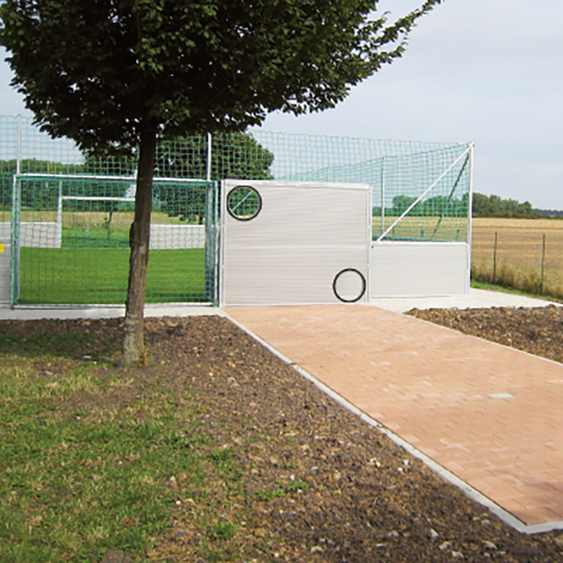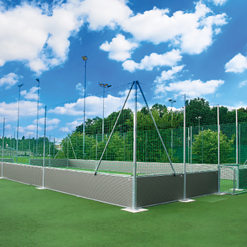 40 mm starke, wetterfeste Sandwich-Bandenelemente aus PU-Hartschaum mit Stahlschale 0.75 mm. Verbindungs- und Toranbauelemente aus Stahlrohr, feuerverzinkt mit integrierter Aufnahme für die Netzpfosten. Netzhöhe 4m über Boden. Aluminiumtor 180 x 120 cm oder 300 x 200 cm mit Netzbüglen aus Stahlrohr, feuerverzinkt.
