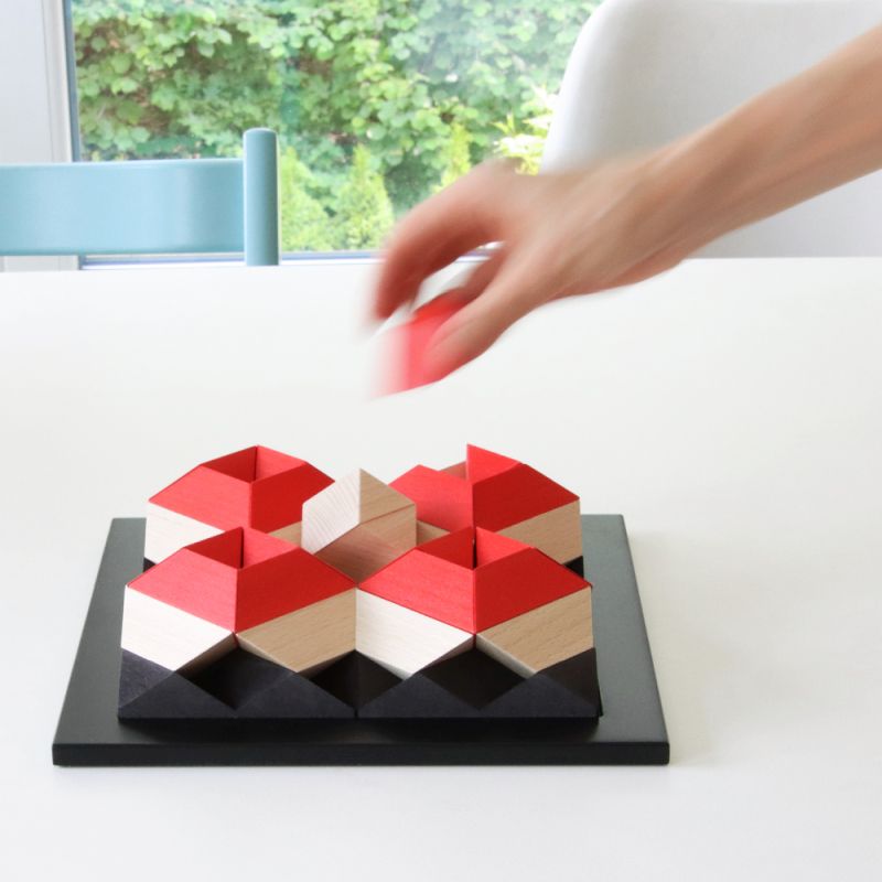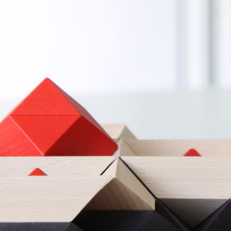 Geometrie in faszinierender Schönheit spielend erleben, das ist PYROM. Der Elementarbaustein wurde auf der Grundlage eines archimedischen Körpers entwickelt: dem Rhombendodekaeder. Die vier quadratischen Aufbauplatten, die in eine Quadratfläche gelegt werden, bilden die Spielbasis. Auf dieser Basis lassen sich mit den beiliegenden vierzig Bausteinen in zwei Farben Strukturen, Reliefs, Pyramiden in unzähligen Variationen legen, formen und bauen. Durch drehen der vier Aufbauplatten entstehen neue Spielmöglichkeiten mit neuen Inhalten und Gesetzen. In ansprechender Produktverpackung.