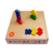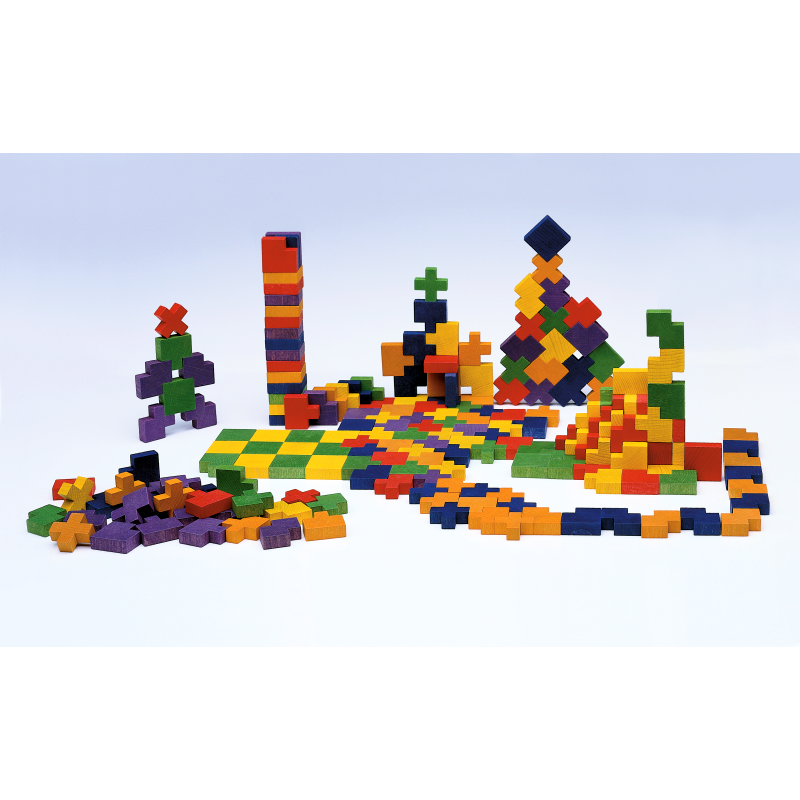 216 Hartholzbausteine (Grundmass 37,5 x 37,5 x 12,5 mm) in sechs verschiedenen Formen und Farben, Bauanleitung.