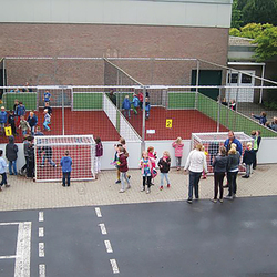 Minispielfeld für eine permanente Nutzung im Aussenbereich mit verlängerten Bandenpfosten in Bodenhülsen. Aufbau: Geschlossenes, umlaufendes Bandensystem mit 2 Fussballtoren mit jeweils seitlicher Eingangstüre. Bandensystem: Höhe 100 cm, Stärke 4 cm, 90°-Ecken, PU-Hartschaum stahlummantelt, Material Grundkonstruktion: Aluminium, Tore: Vollverschweisst, Ovales Profil, inklusive Netz MW 100 mm, Türnetze: Maschenweite 45 mm. Montage nicht im Preis inklusive. Optionale Zusatzausstattung: Netzkonstruktionen, Beleuchtung, Basketball, Volleyball. Sicherheitsgeprüft. Nach DIN EN 15312. Inklusive Erstellung individuellen Fundamentplan