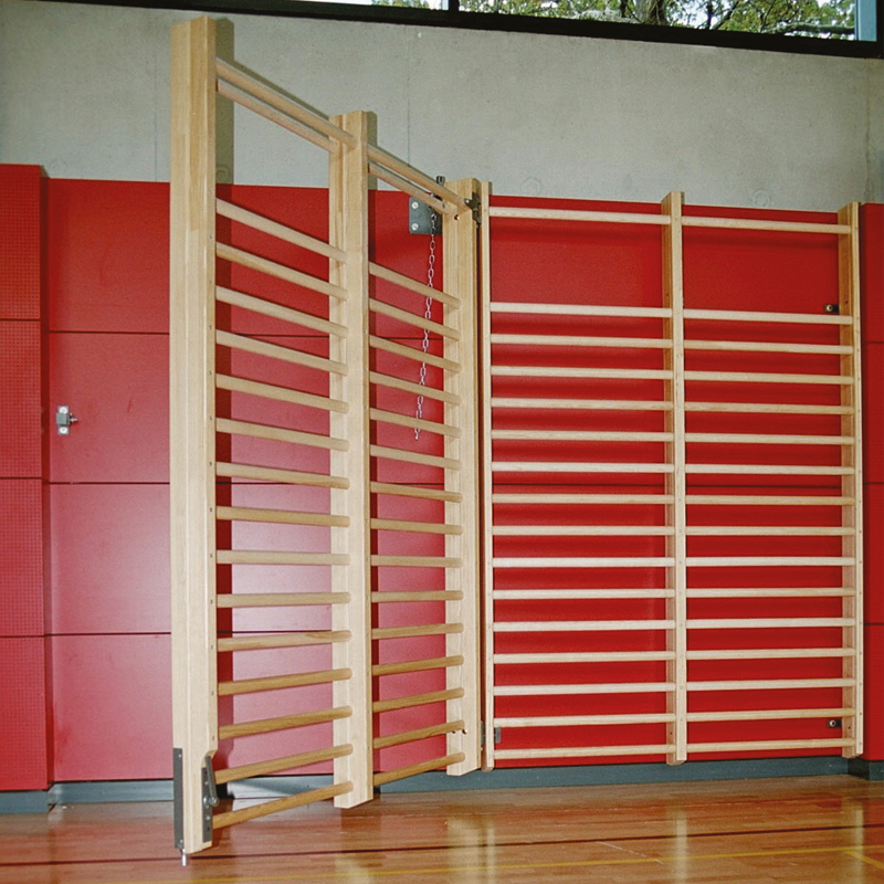 Sprossenwand aus Holz, ovale Sprossen aus mehrfach verleimtem Schichtholz, alle Holzteile farblos lackiert. Wandbeschläge aus Stahl, galvanisch verzinkt. (Auf Wunsch auch farbig lackiert möglich)