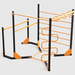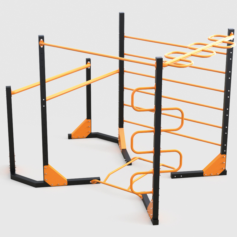Die freistehende Calisthenics-Anlage ist ohne Fundamente oder Bodenbefestigung überall in kurzer Zeit auf- und wieder abbaubar. Die Stangen können je nach Anwender beliebig in der Höhe montiert werden.