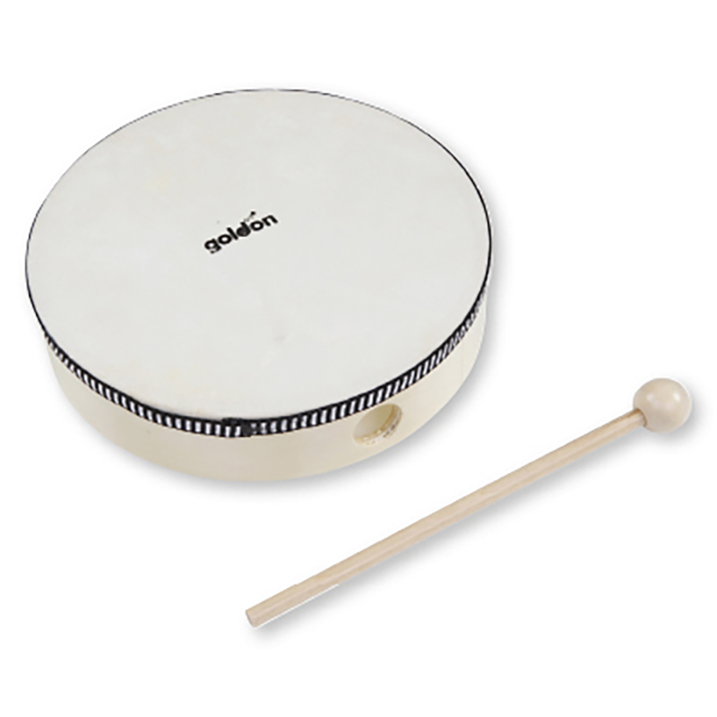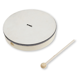 Tamburin hat einen Korpus aus Holz und einen Naturfellbezug. Ein Schlägel ist enthalten. Das Tamburin ist zwei verschiedenen Grössen erhältlich.