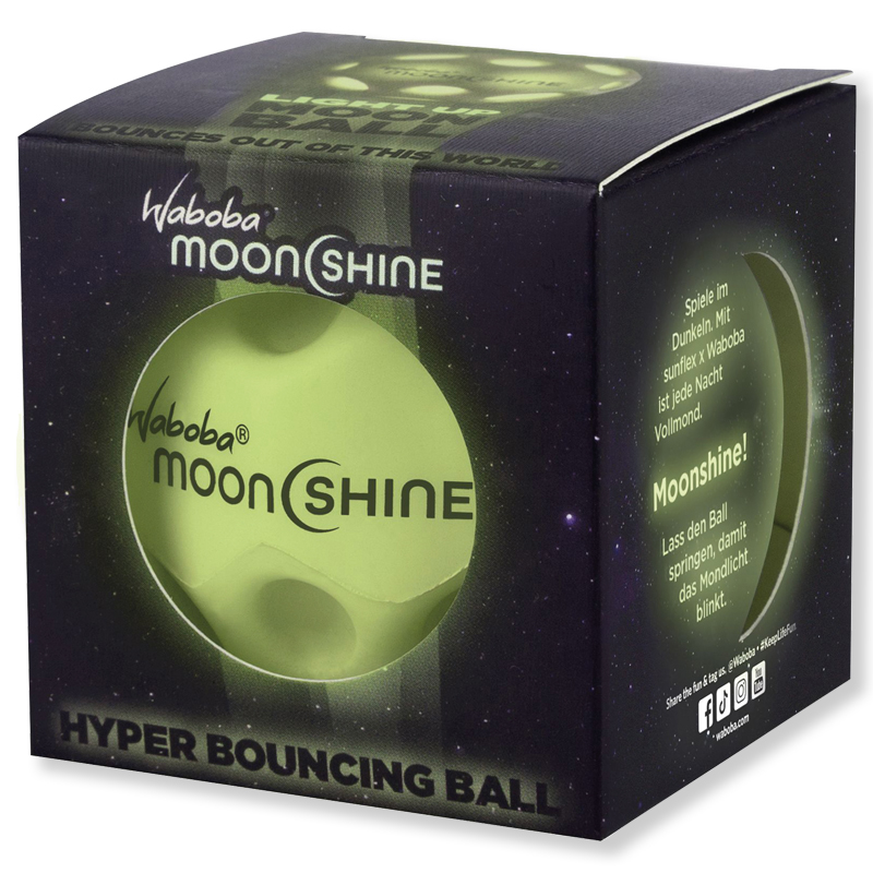 Der Waboba® Moonshine ist eine neue Version des bekannten Waboba® Moon Balles. Im inneren des Balles befindet sich eine kleine LED die beim Aufprall anfängt zu leuchten. Er hat ein sehr leichtes Gewicht, eine enorme Sprungkraft und einen besonderen Spin aufgrund seiner speziellen Form.